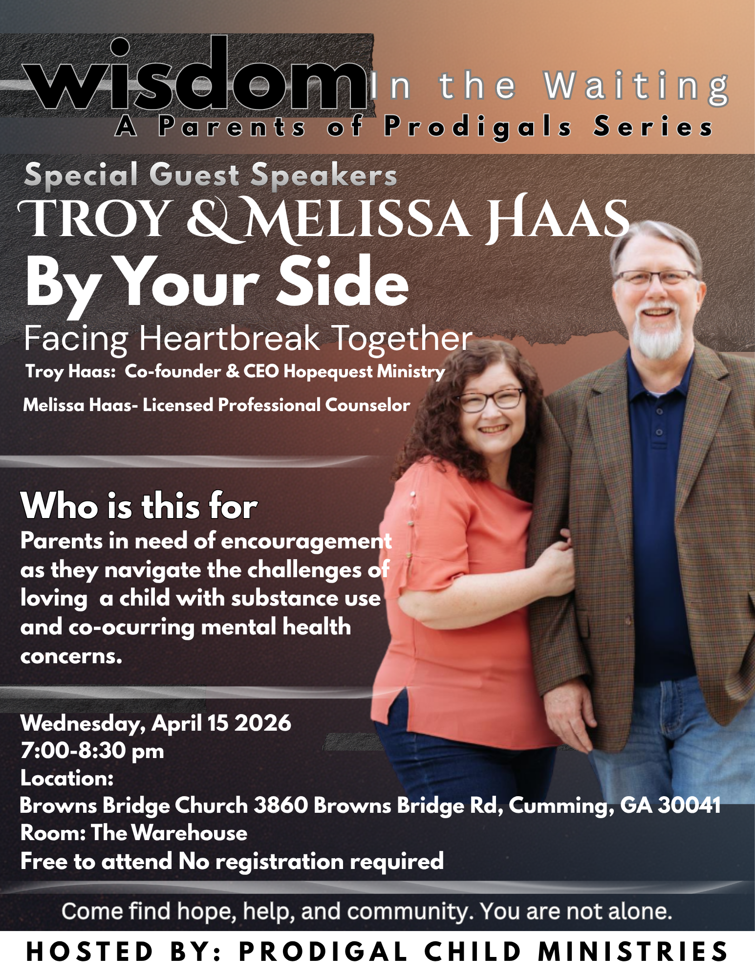 We feel honored and humbled to have the opportunity to lead Prodigal Child Ministries. The mission is close to our hearts because we have two children, one of whom struggles with addiction and a mental health condition. As parents of a prodigal child, we know what it's like to feel alone, but we've also experienced the benefits of attending a Parents of Prodigals support group. Discovering that we're not alone on this journey brings a sense of freedom. We are dedicated to providing hope, healing, and faith-based guidance for parents like us who need encouragement. Our retreats, support groups, and compassionate outreach are designed to remind parents that they are never alone.